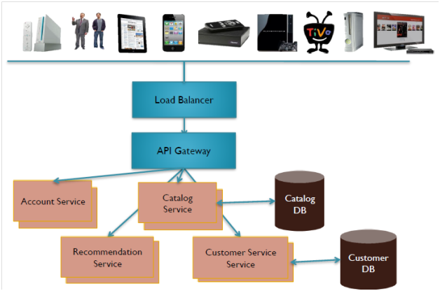 En el segundo ejemplo (Figura 3), cada microservicio tiene su propio almacenamiento de datos. También podemos notar que existe un API Gateway en el medio, que representa el API común al cuál acceden los clientes (browsers, teléfonos, etc.) y que se encarga de hacer el routing de las peticiones a los distintos microservicios.