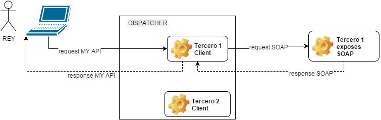 Dada esta circunstancia, la solución que se propuso fue implementar varios microservicios traductores capaces de hablar SOAP/REST con terceros, y traducir la información de estos a información que se adecue al API “MY API” expuesto por el software del cliente.