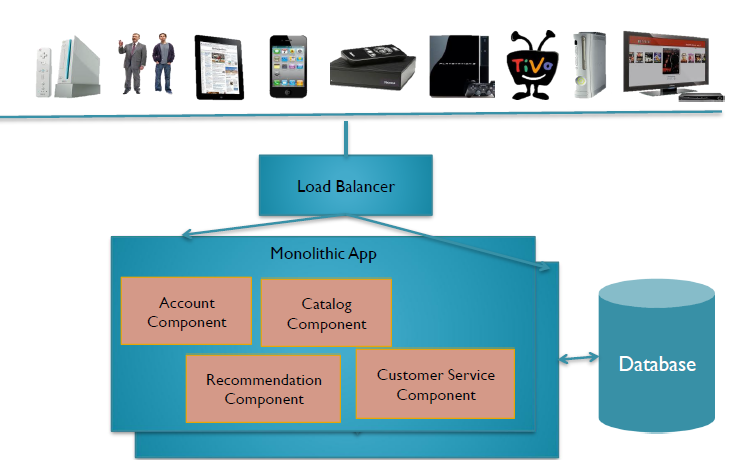 Se presentan a continuación dos esquemas a modo de ejemplo. En el primero (Figura 2) se tiene una aplicación monolítica que accede a una base de datos para obtener información.